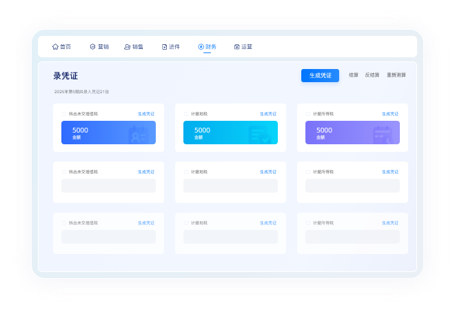 根據(jù)用戶偏好自動(dòng)匹配記賬模板,有效預(yù)防重復(fù)記賬現(xiàn)象;將憑證附件進(jìn)行電子化保存;實(shí)現(xiàn)業(yè)務(wù)單據(jù)、日記賬、固定資產(chǎn)和工資的一鍵式憑證生成,以降低財(cái)務(wù)人員的勞動(dòng)強(qiáng)度。